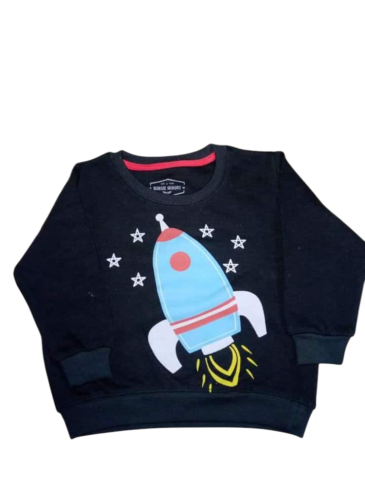 This trendy kids black sweatshirt is made from soft and warm fleece fabric, perfect for keeping kids cozy during winter. It features a fun rocket print on the front, giving it a cool and adventurous look. Designed for comfort and easy movement, this sweatshirt is ideal for casual wear, school, and playtime.
