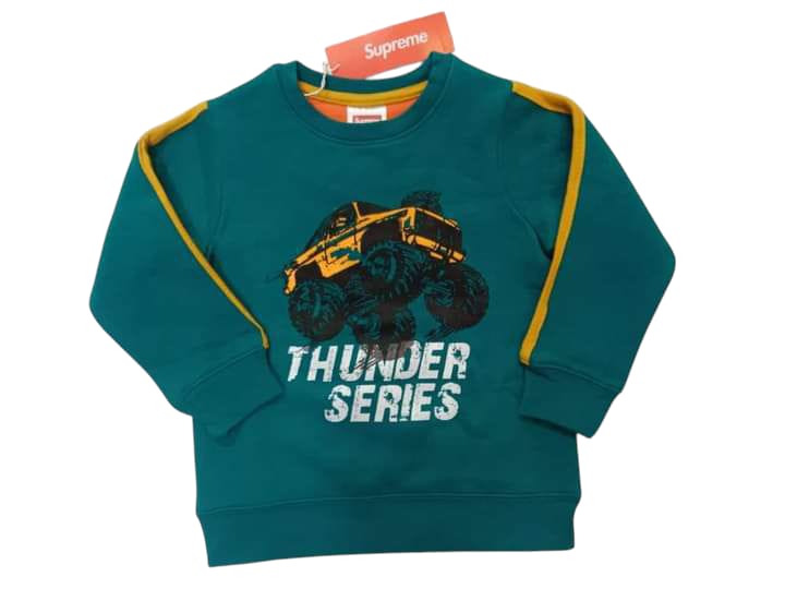 This stylish kids green sweatshirt is made from soft and warm fleece fabric, perfect for everyday winter comfort. It features a bold Jeep print on the front, adding a fun and adventurous look. The yellow stripe on the sleeve enhances the sporty design and makes the sweatshirt stand out. Comfortable and durable, it’s ideal for casual wear, school, and playtime.