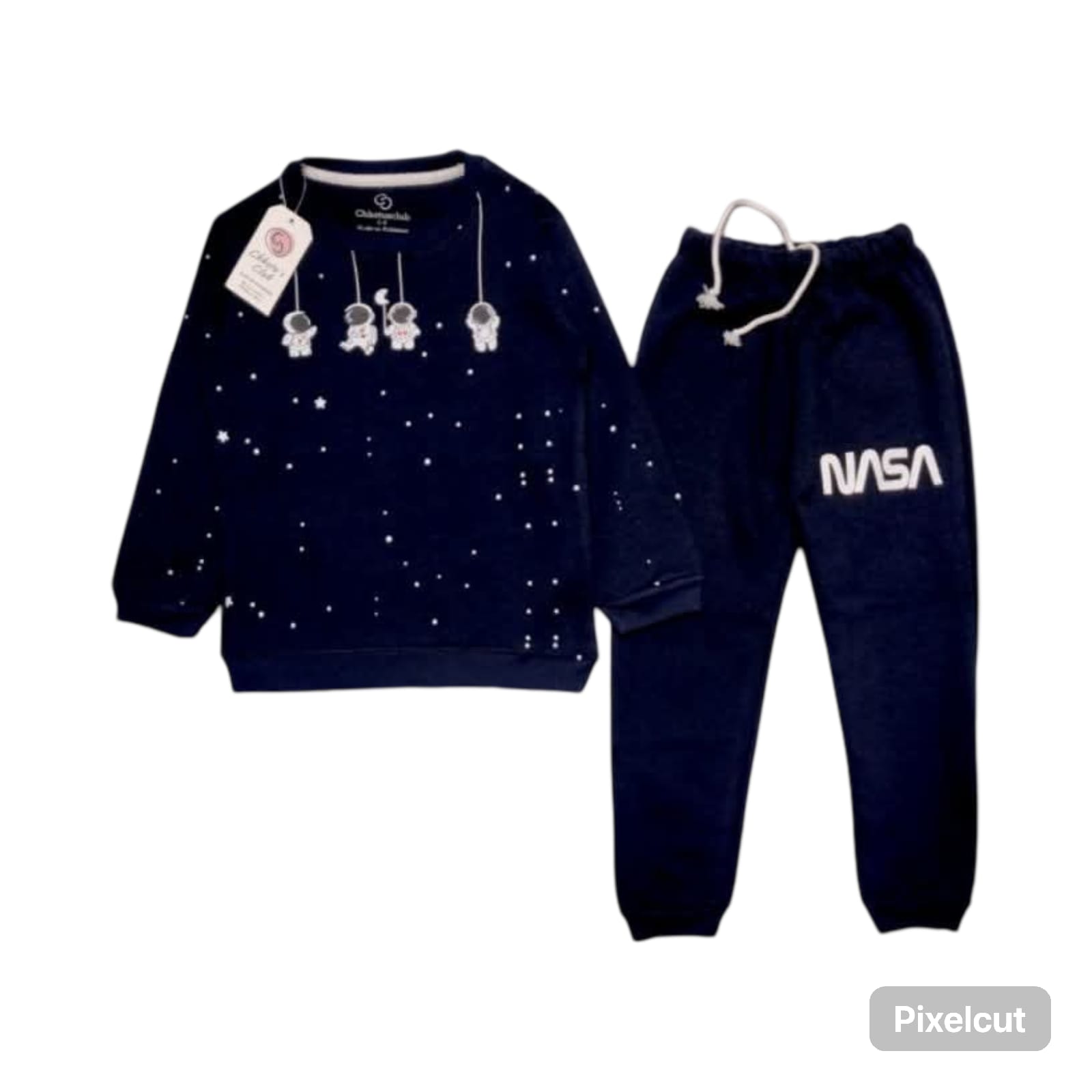 This cool kids dark blue track suit is made from soft and warm fleece fabric, perfect for keeping children cozy during winter. The sweatshirt features a vibrant NASA print on the front, adding a fun and adventurous space-themed look. Paired with matching dark blue fleece trousers, the set provides a comfortable fit that allows easy movement. Ideal for casual wear, school, playtime, and everyday winter activities.