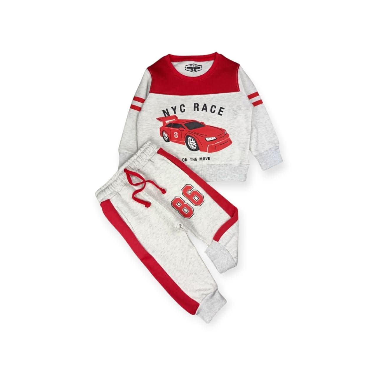 This fun kids track suit features a vibrant light grey sweatshirt with red accents paired with matching fleece trousers, perfect for winter wear. The sweatshirt showcases a racing car print, adding a playful and energetic touch for little motorsport fans. Made from soft and warm fleece fabric, the set ensures comfort and freedom of movement, making it ideal for casual wear, playtime, and everyday winter activities.